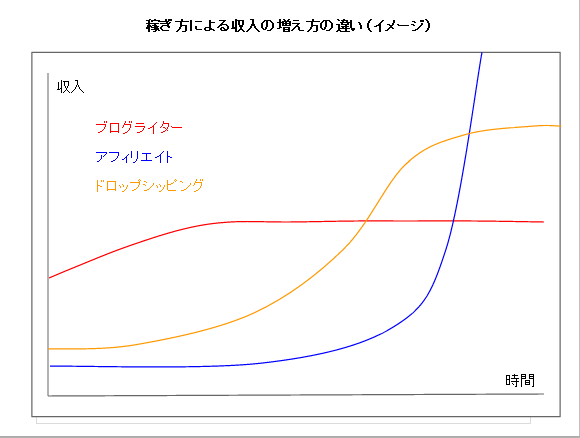 ここで、私のイメージする稼ぎ方による収入の増え方の違いをグラフにしてみました。